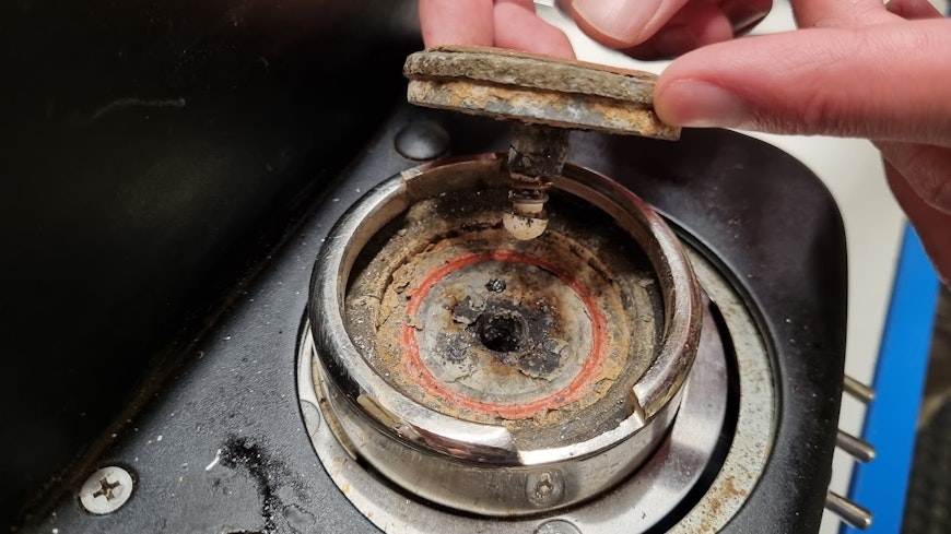 You can’t win ‘em all, and sadly our efforts to repair Consumer chief executive Jon Duffy’s Ascaso espresso machine were unsuccessful. The machine’s portafilter and group head were completely gunked up with burnt coffee residue.