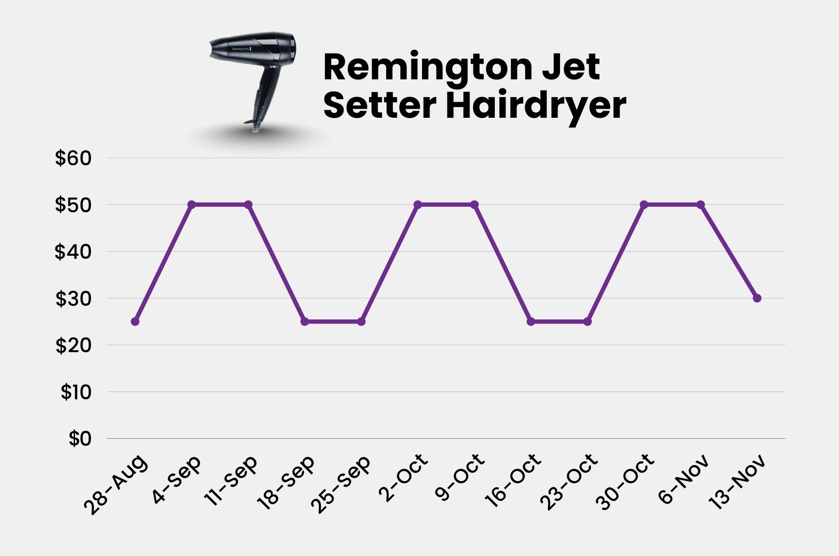 The Remington Jet Setter hairdryer was also labelled at “now” pricing for 9 of the 12 weeks we tracked, appearing to be at its usual selling price for just 3 weeks.