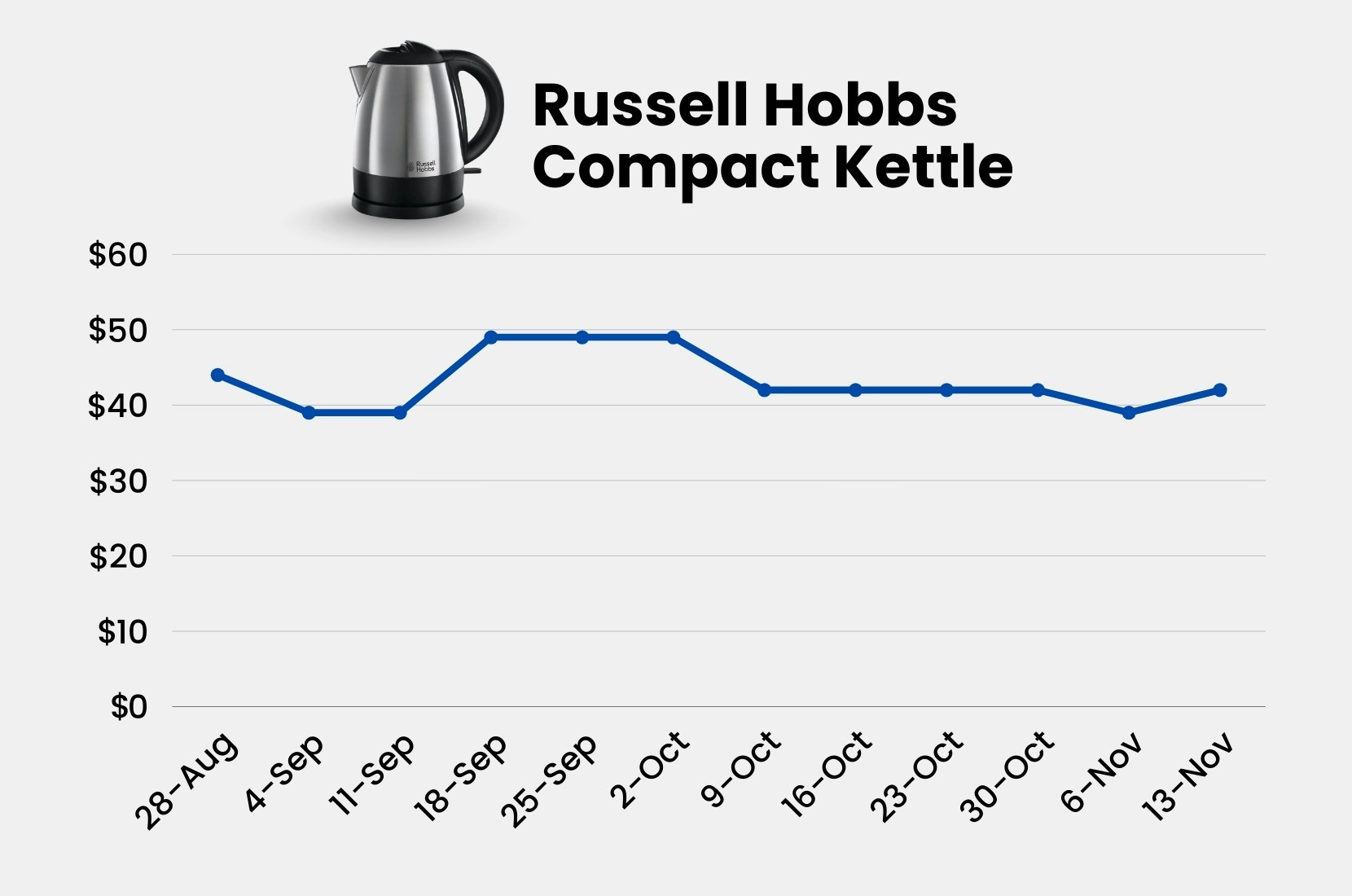 We tracked a Russell Hobbs kettle that was on sale for 11 weeks straight; and was labelled a “great price” for 5 out of those 11 weeks. The “great price” ranged from $39.00 to $49.00. In the same price range, it was also labelled as a “super deal”, a “huge deal”, “now” and a “massive stock sellout”.