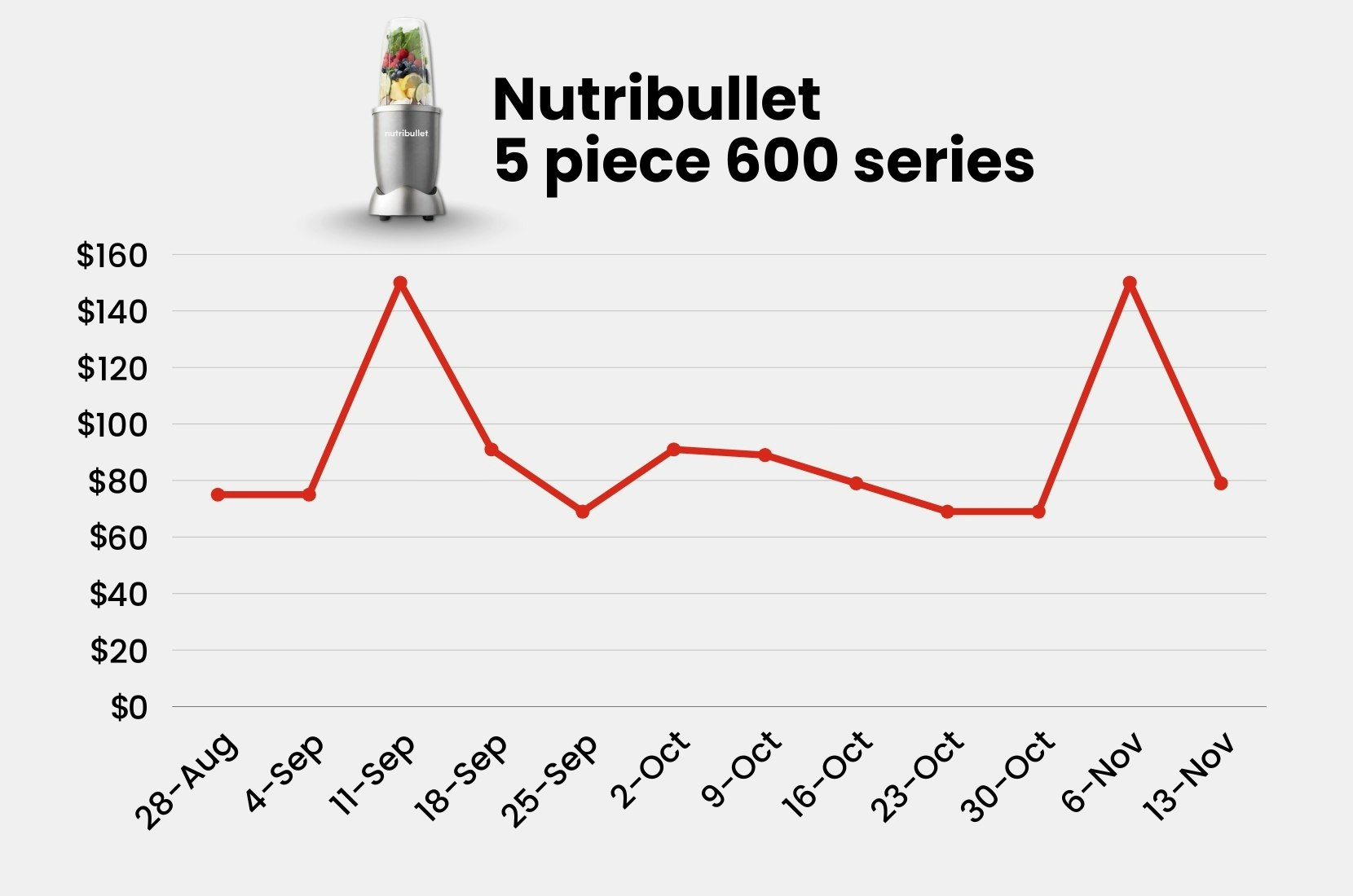 The Nutribullet also appeared to be on special for 10 out of the 12 weeks, but the price varied from $69 to $149.99.
