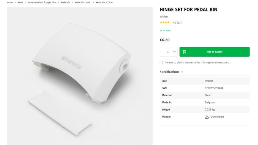 So, then I looked for a 3D print file of the rest of the hinge, but to no avail. That’s when I decided to order the spare parts direct from Brabantia.