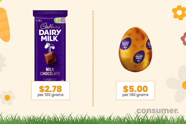 “We calculated you could save money if you bought a 100g Dairy Milk egg and a pack of mini Creme Eggs. That would set you back $12.50, for a choccie treat of 210g, which works out at $5.95 per 100g.”