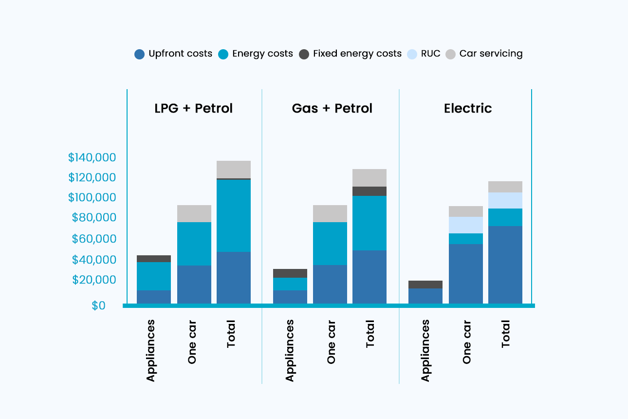Vehicles take the lion’s share of the overall energy needs of a household, but this is an area with more uncertainty, and more cost than other areas. The introduction of road-user charges (RUCs) has certainly made the waters murkier for potential buyers in thinking about vehicle electrification. But the data is now telling us, even with RUCs, electric vehicles (EVs) and petrol cars come out roughly the same cost when you include all costs over their lifetime including fuel.