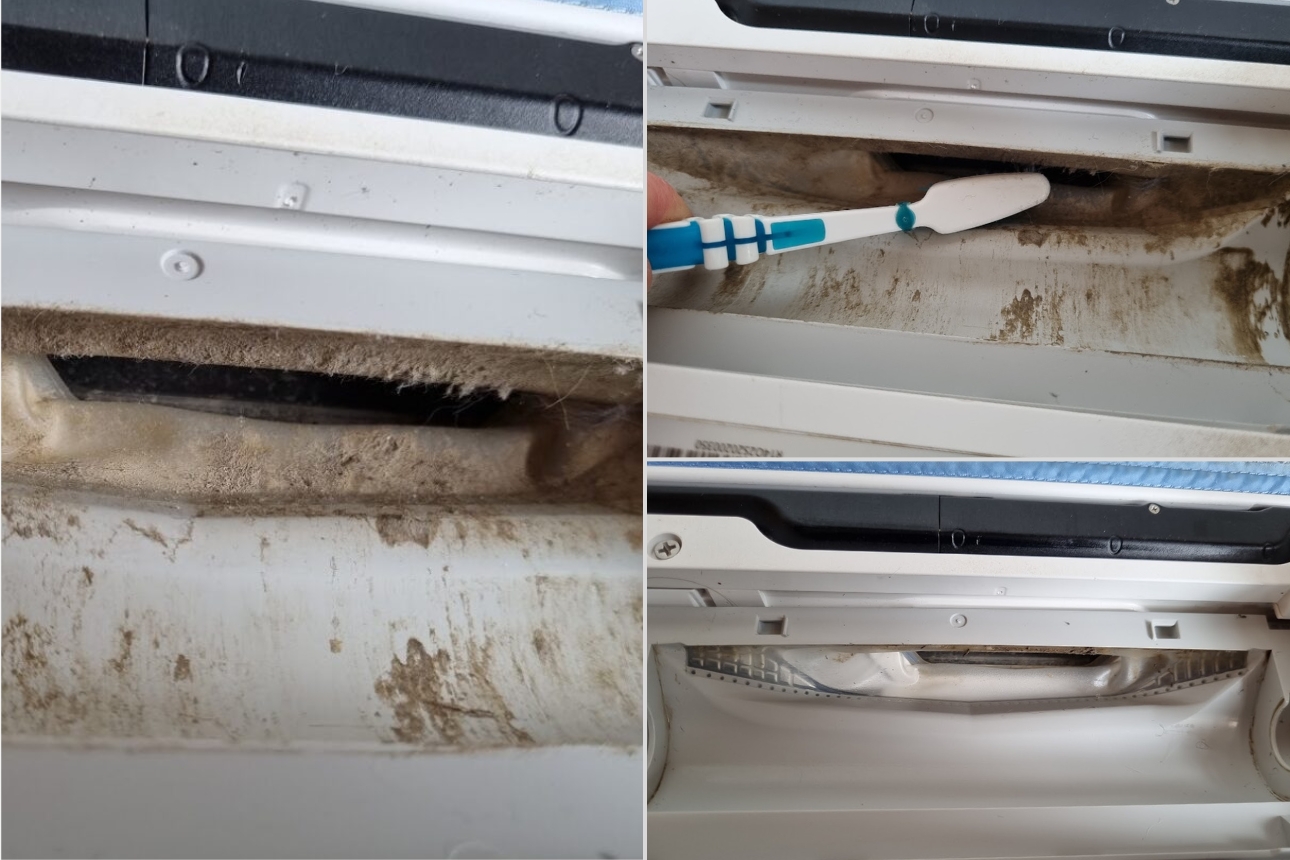 Left: Removing side brush / Right: Trapped dust and dirt