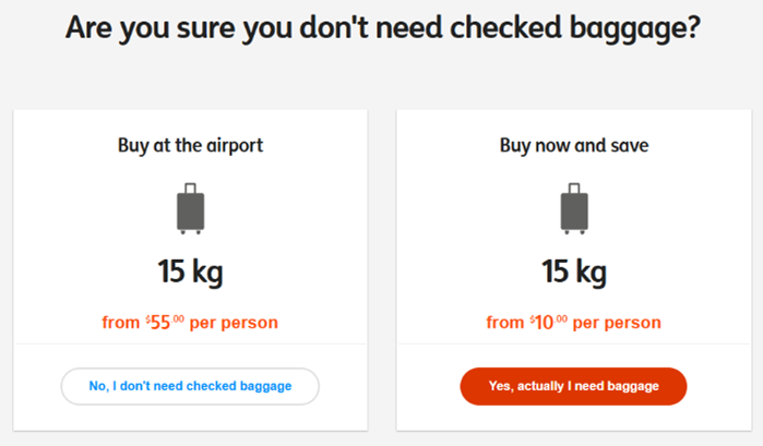 We saw a few examples of confirmshaming when adding bags with Jetstar.