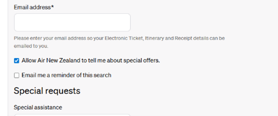 Air New Zealand’s website uses pre-selection when it comes to opting into marketing emails. When you’re buying an airfare, you’ll have to remember to opt out by unselecting the box.