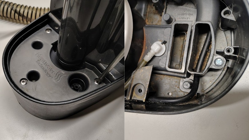 The YouTube repair video I’d watched showed that a kink in the delivery hose could be the cause of the lack of squirting action. This hose resides in the base but isn’t difficult to get to. I detached both the water tanks, which revealed 3 screws on either side to access the base internals.