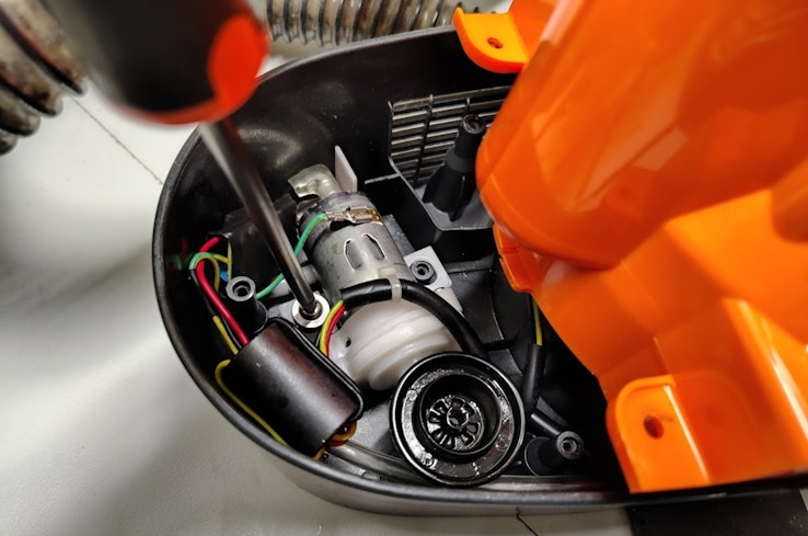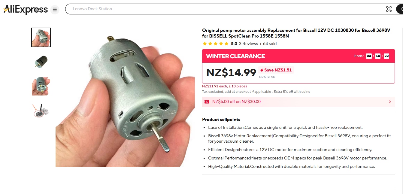 For Bissell no 2, I considered replacing the motor due to its condition. I found a replacement on AliExpress for only $15. I nearly hit the ‘buy now’ but noticed there was no metal tang for the earth wire connection. The seller said it wasn’t required, and to some extent, they were right – the pump would still work. But Bissell put that earth connection in there for a reason, so I wasn’t going to risk an electrocution. You could, of course, solder on a tang yourself, but that’s a step too far in this repair story.