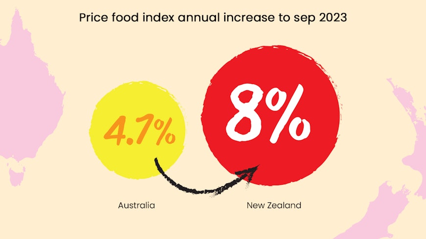 New Zealand had an 8% food price index increase to September, according to Stats NZ, compared to Australia’s 4.7% increase to September.