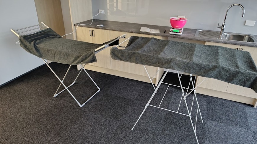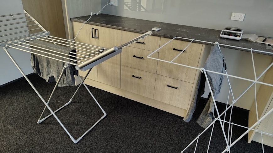 We set up the drying racks side by side in the warm Consumer NZ office. We took two identical towels, with a dry weight of around 600g each, washed them, spun them at 1200rpm and then weighed them damp. Then we draped each towel flat over one of the racks. We did this to maximise contact with the heated rails. Every hour, we weighed the towels to see which was drying faster.
