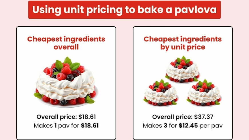 “If you need eggs for whipping up the pavlova, unit pricing will make it easy to see what you’re paying for each egg regardless of whether you’re comparing 6, 10, 12 or 18 packs.”