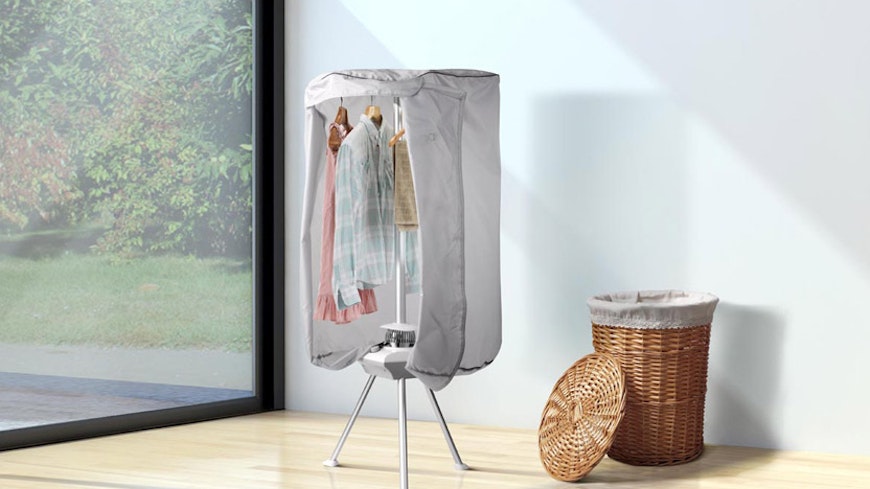 Running a dehumidifier next to the clothes rack adds cost, but you get a triple-whammy of benefits: the dehumidifier heats the room, creates a breeze to help the laundry dry, and sucks up moisture. When I tried a Mitsubishi Electric model running full bore on “laundry” mode next to the drying rack, my clothes were dry in five hours and my room ended up 3°C warmer, with lower humidity than when I started. However, the dehumidifier used 1.9kWh of electricity (costing about 50¢). While I couldn’t fault the increased drying performance, the impact on my wallet was surprisingly high, and the dehumidifier’s noise rendered the room uninhabitable for five hours.