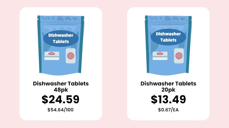 Imagine you’re trying to work out which pack of toilet paper to buy – the decision might be between a 4-pack, a 6-pack or an 8-pack. Unit pricing lets you see how much you’ll pay per 100 sheets. Of course, you might still want to take ply into account, but it’s easier to see which product gives you more bang for your buck.