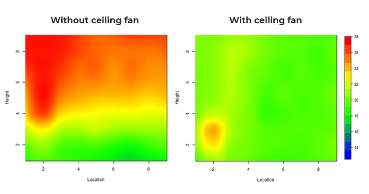 The temperature profile across our test lab completely evened out. Without the fan, the ceiling was almost 30°C, while the air gradually cooled as it got lower. This affects your feeling of comfort as you end up with a hot head and cold feet.