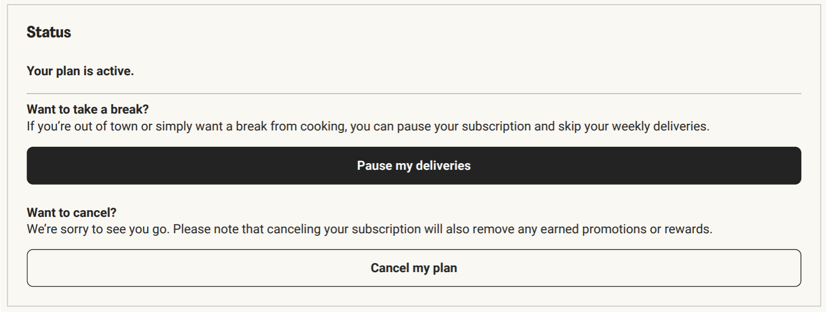 HelloFresh’s solution is not to let us cancel, removing a financial burden, but to suggest referring a friend in exchange for some free credit, or to modify our plan to receive fewer meals.