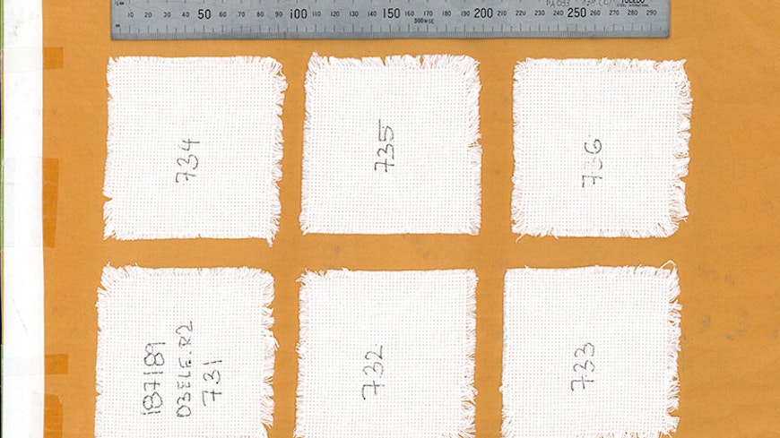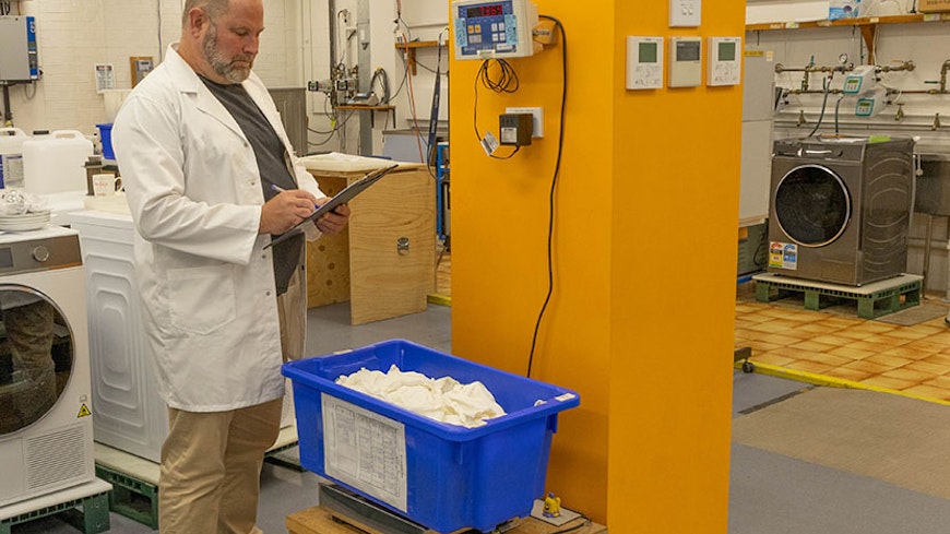 Specially prepared swatches of fabric, pre-stained with a specific amount of dirt, are attached to a standard wash-set of linen garments. These swatches are the same as those used for international Standards tests.