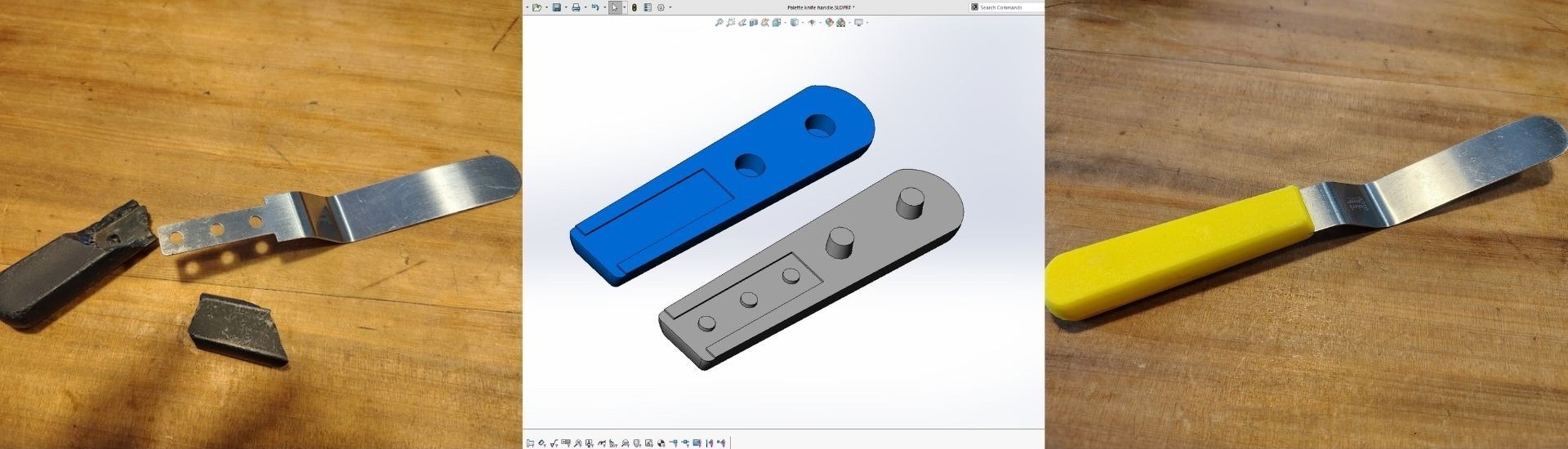My wife’s palette knife that helps decorate many delicious cakes needed a new handle. Searching the many 3D print websites such as Thingiverse and Printables, I didn’t find a file. But luckily, I have 3D modelling skills so modelled a new one up myself using CAD (computer aided design). A vernier calliper gauge was vital for this to measure and make sure everything fits. I designed the handle in two parts to sandwich the blade, just like the original, and glued it all together.