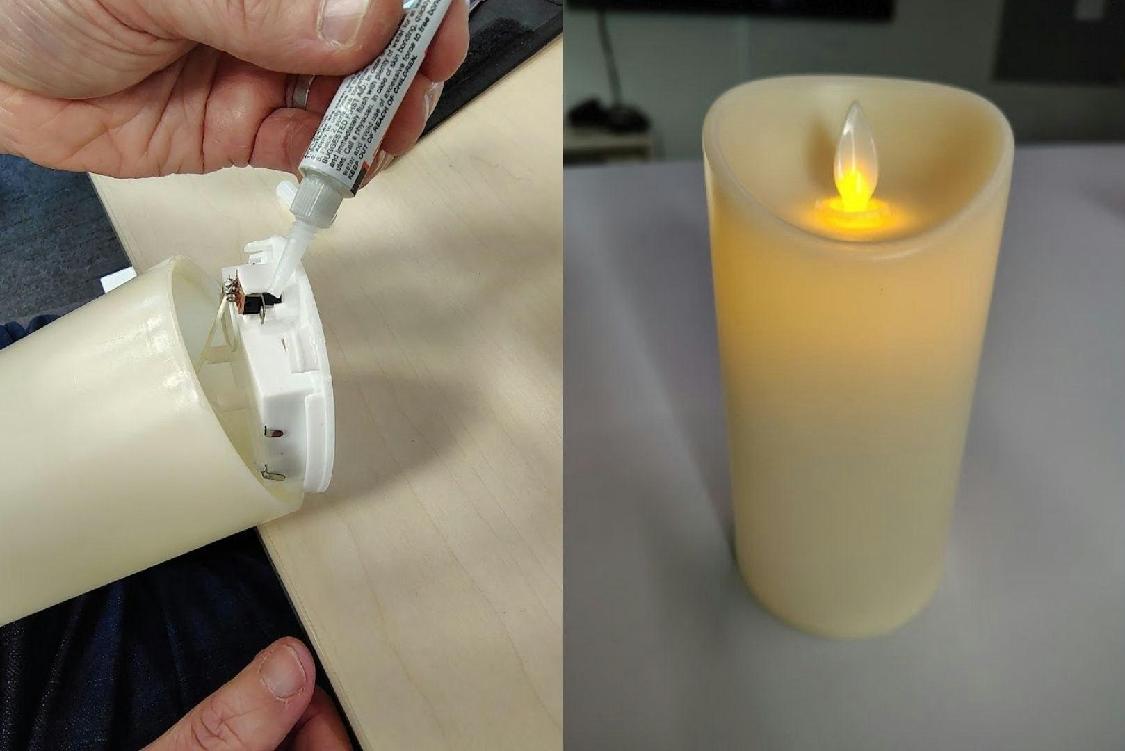 It’s not only expensive items that are worth repairing. When my colleague, Abby’s, LED candle broke, I offered to fix it. The candle could no longer turn on because the switch had been pressed down into the housing. Luckily, the base could be twisted off to access the switch. It was then easy to pop the switch back onto its mounting lugs and add a drop of superglue to stop it happening again. More plastic saved from landfill.