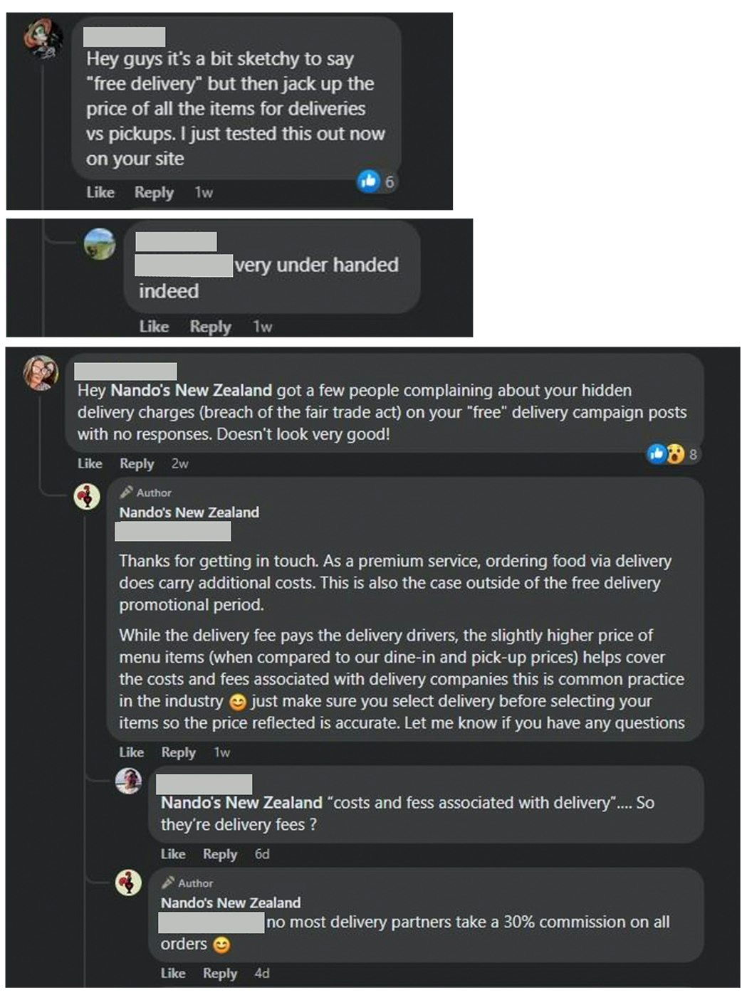 Take a look at the Facebook page for Nando’s NZ and you’ll see that every post advertising its so-called ‘free’ delivery deal is met with backlash from customers in the comments section.