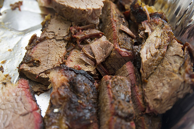 Brisket is a cheap cut of meat that needs cooking for a long time over a low heat to break down tough connective tissue (exactly how long depends on the size of the meat, but usually at least 6 hours). The result should slice easily but not disintegrate. For each barbecue, I used soaked apple, hickory and mesquite woodchips (soaking woodchips means they smoulder instead of burn, and each wood type gives a different flavour).