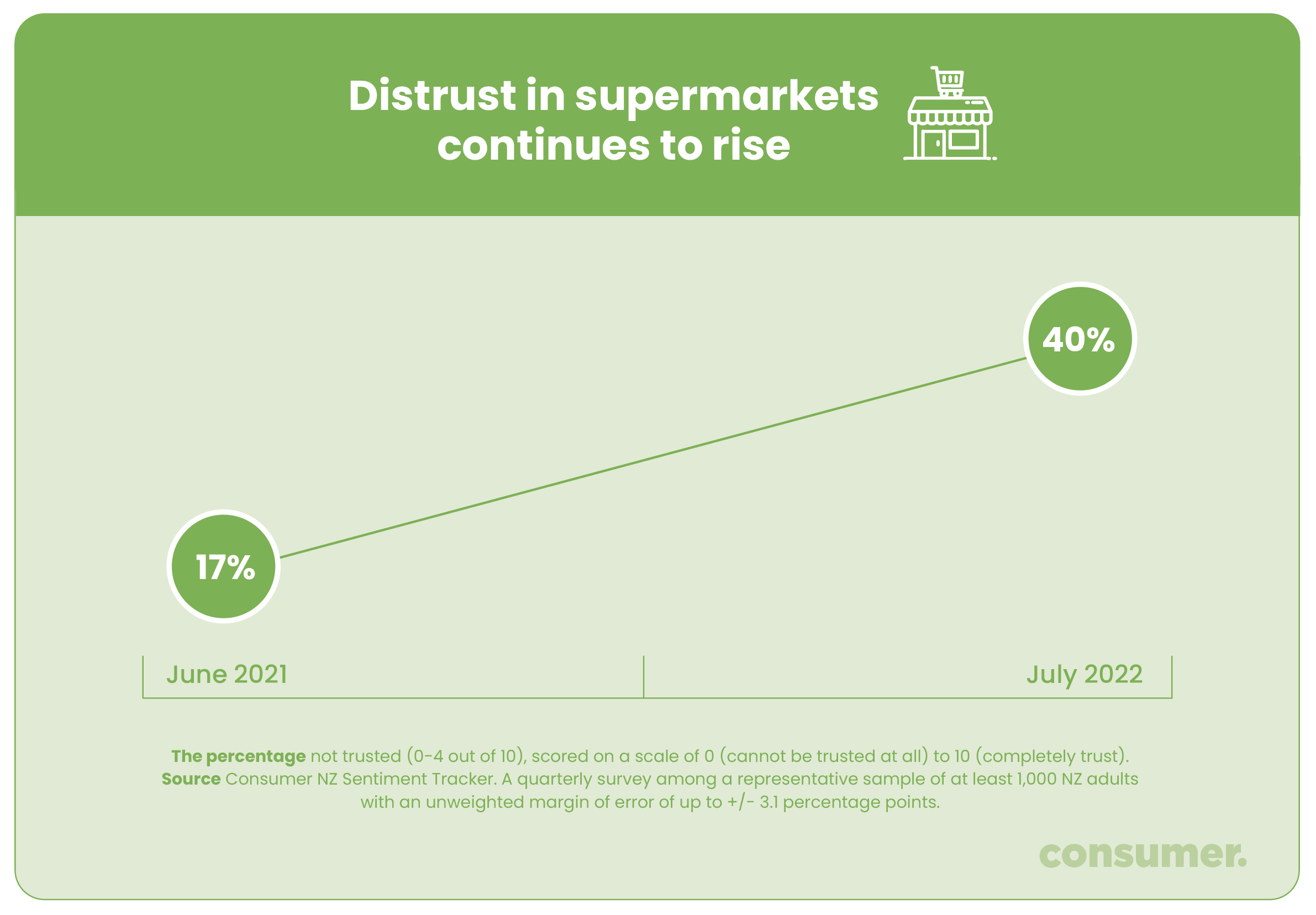 Our nationally representative research found that trust in the major supermarkets has plummeted over the past 12 months. In June 2021, 17% of New Zealanders said they did not trust the supermarkets. Fast forward to July 2022 and lack of trust in the industry has reached 40%.