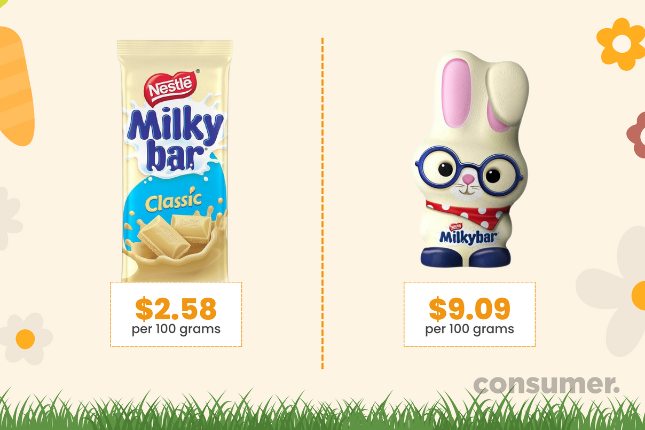 By way of comparison, a classic 170g of Nestle Milkybar costs $4.39. The bunny version of the sweet treat costs a whopping 252% more per 100g.