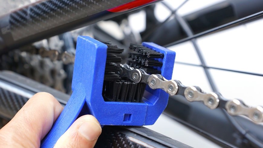 Pro-tip: Get someone to help you flip the bike upside down and slowly turn the pedals as you clean the chain with the brush and spray on the lube.