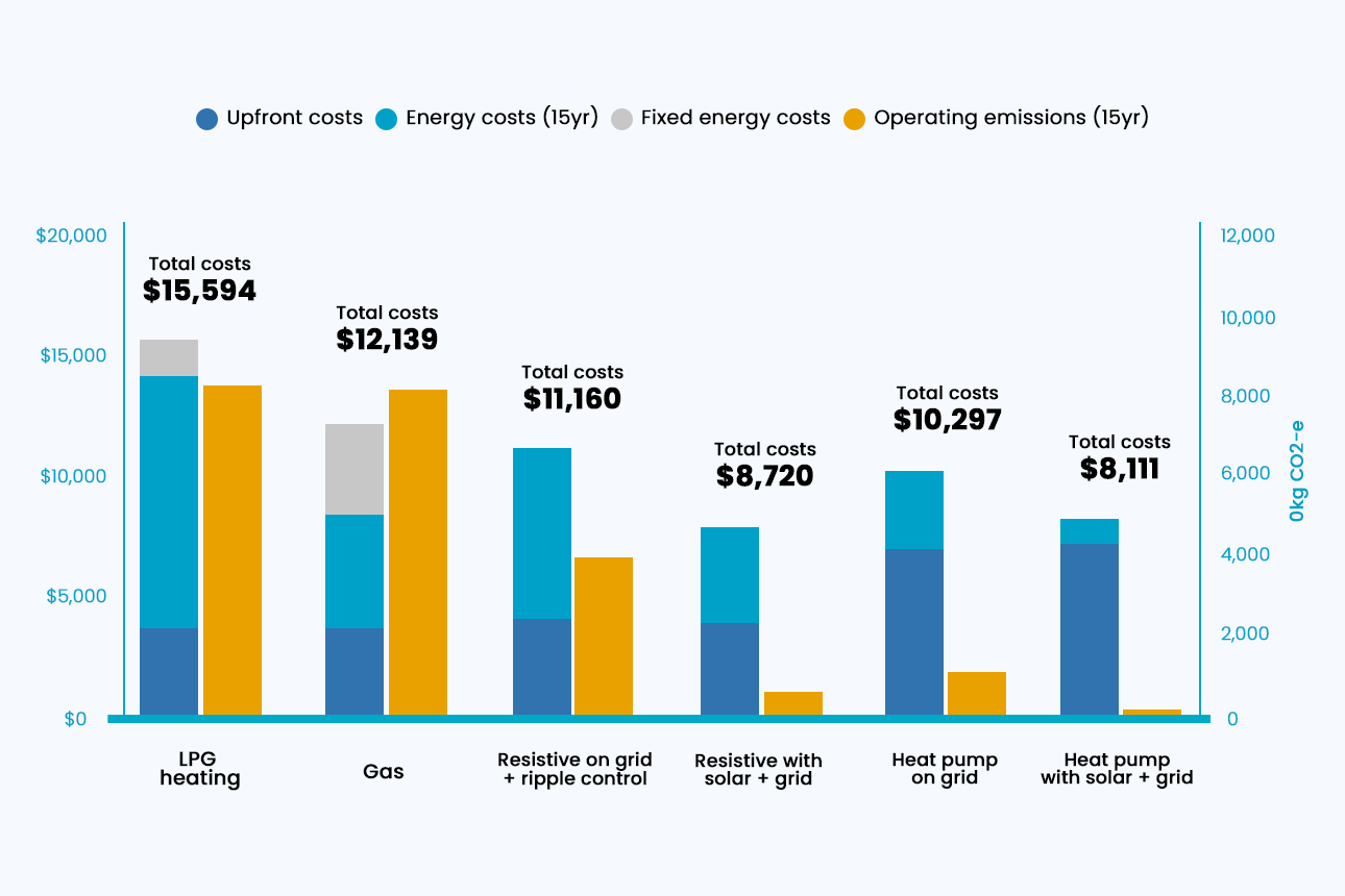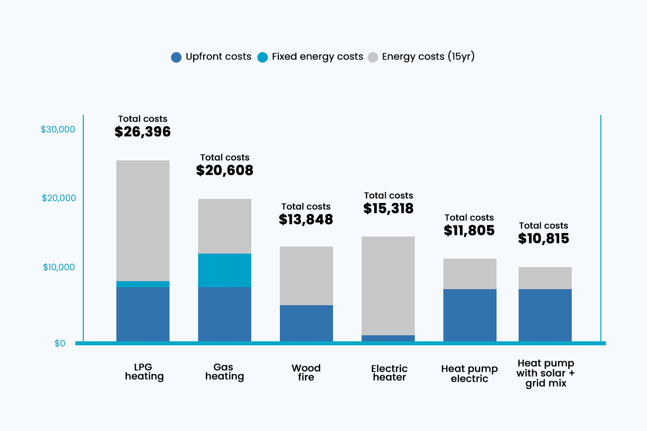 Comparing the total costs of water heating shows a clear difference in upfront expenses for each option. Heat pump water heaters have a much higher initial cost, but they’re way cheaper to run, and come up trumps for lifetime costs. Over 15 years you stand to save over $1,800 over piped natural gas, and over $5,000 if you stayed on LPG.