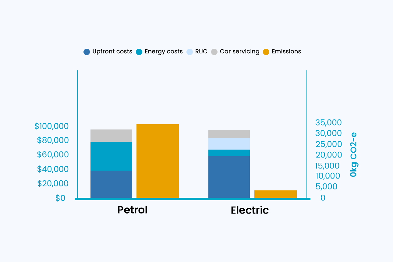 Vehicles take the lion’s share of the overall energy needs of a household, but this is an area with more uncertainty, and more cost than other areas. The introduction of road-user charges (RUCs) has certainly made the waters murkier for potential buyers in thinking about vehicle electrification. But the data is now telling us, even with RUCs, electric vehicles (EVs) and petrol cars come out roughly the same cost when you include all costs over their lifetime including fuel.