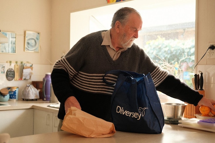 Once he's ventured inside the supermarket’s yellow front doors, Bernard pulls out a pen and a small notepad. On it is a list compiled by the pair over the week. It reads: "Tomato relish, Sunlight soap, potatoes, scroggin, biscuits, 2 x cornflakes, WeetBix, corn beef, lettuce, fruit, 2 x milk, 4 x soy milk, veges, ice cream, onions, cold meat, 2 x bread, and radishes."