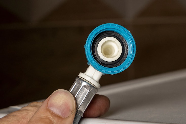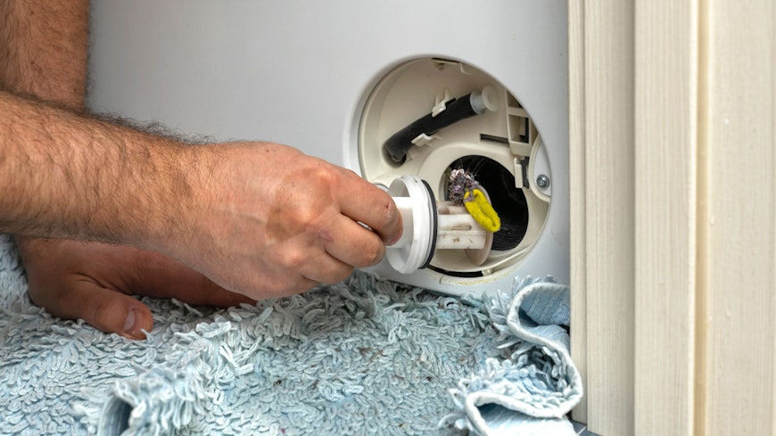 Inlet filters stop the entry of minerals and debris from the water supply into the washing machine. Cleaning the inlet filters can be tricky as it usually requires pulling the washing machine out from the wall to access the rear panel. Most machines will have a mesh screen filter on the water inlet on the rear. There may also be a filter on the tap end of the hose. These only need checking if you have debris or a lot of limescale in your water. You’ll need to turn off the tap to your washing machine first and drain the hose or have a bucket ready to collect the water.