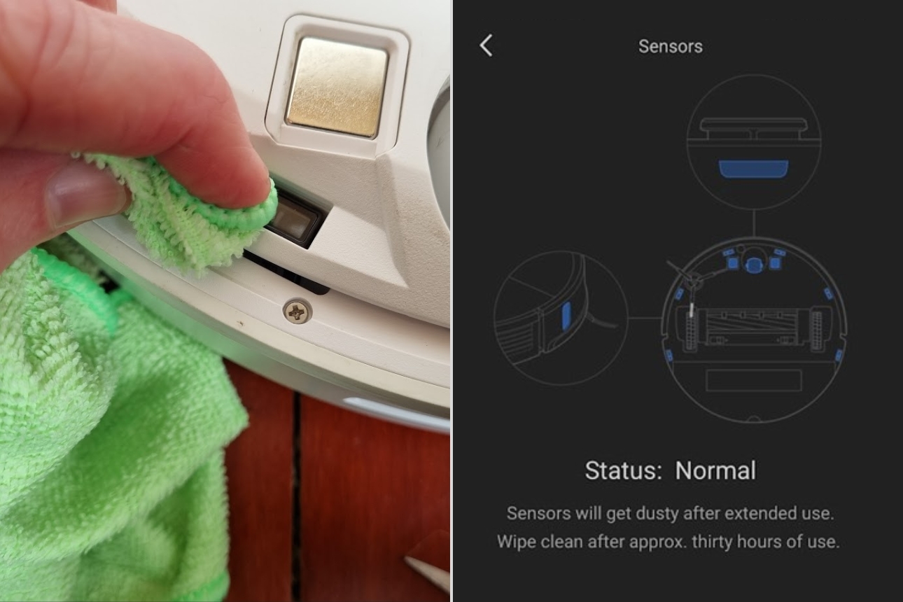 Left: Cleaning charging contacts / Right: Roborock s7 sensor location in app