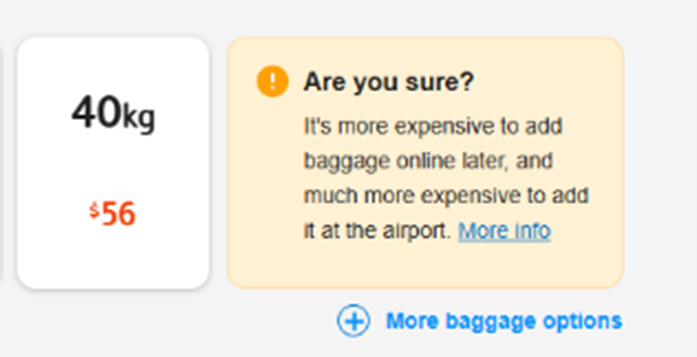 The effect is to encourage you to second-guess a decision you’ve already made. And the reference to the cost of adding bags in the future is a not-so-subtle attempt to make you consider what-ifs you otherwise wouldn’t be swayed by. What if I accidentally pack too much? What if I do actually need an extra bag?