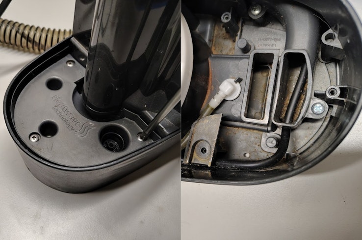 The YouTube repair video I’d watched showed that a kink in the delivery hose could be the cause of the lack of squirting action. This hose resides in the base but isn’t difficult to get to. I detached both the water tanks, which revealed 3 screws on either side to access the base internals.