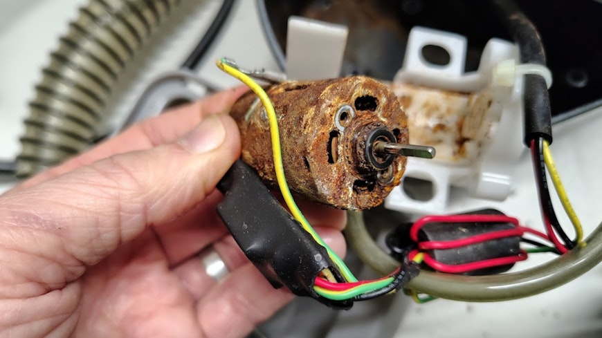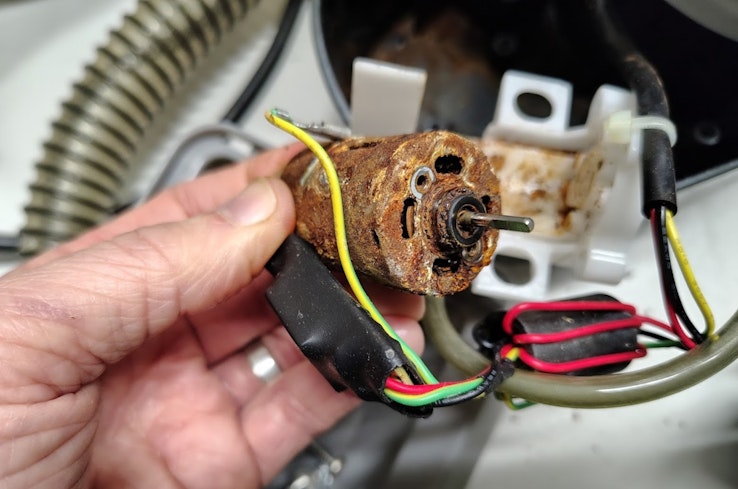 For Bissell no 2, I considered replacing the motor due to its condition. I found a replacement on AliExpress for only $15. I nearly hit the ‘buy now’ but noticed there was no metal tang for the earth wire connection. The seller said it wasn’t required, and to some extent, they were right – the pump would still work. But Bissell put that earth connection in there for a reason, so I wasn’t going to risk an electrocution. You could, of course, solder on a tang yourself, but that’s a step too far in this repair story.
