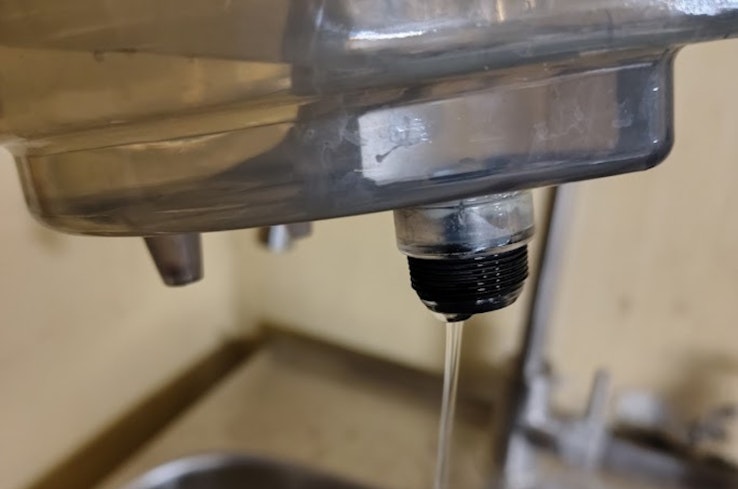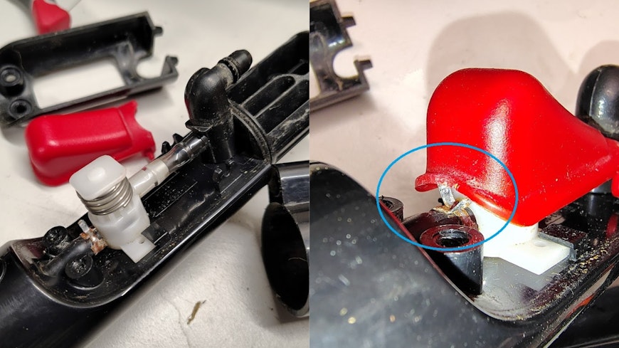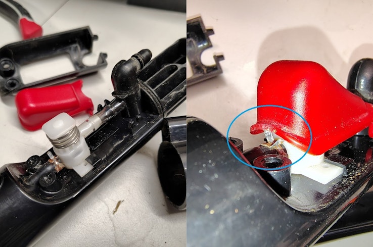 In this case, the delivery button wouldn’t depress. Unscrewing the cover revealed the simple issue. Someone had probably thought there was a blockage at the nozzle and had taken off the hose but not replaced the hose clamp correctly. That left the clamp interfering with the button’s movement. Just twisting the clamp 90 degrees sorted the problem, and once re-assembled, we had a fully functional unit.