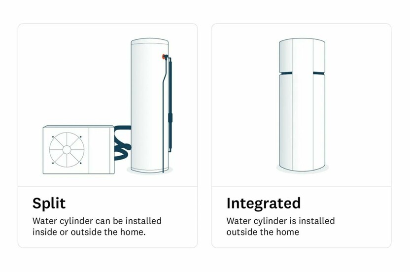 There are two types of HWHP – split and integrated. Split models separate the hot water cylinder from the heat pump compressor, so you can have the tank installed inside your home, with the compressor unit outside. The installation for a split system may be more expensive than for an integrated one, as you need to connect the compressor to the tank and they might be some distance apart.