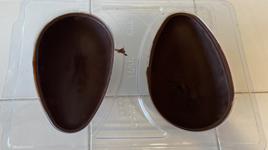 First, I’d need to use high-quality chocolate containing cocoa butter and cocoa solids, not compound chocolate. Compound chocolate replaces cocoa butter with less expensive fats, such as palm or coconut oil, and has a chemical structure less suited to the moulding process. (Cooking chocolate is often compound chocolate – check the pack.) Gabe also told me that a higher cocoa content – between 60% and 70% – would create a richer-tasting egg.