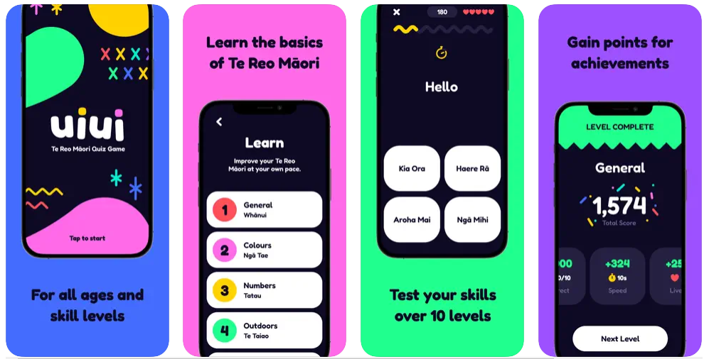 A colourful, vibrant quiz app, Uiui was launched for Māori Language Week in 2022. It’s a fairly basic way to test yourself on your vocabulary, but it’s gamified well enough to motivate players to learn more words to improve their scores (especially, I suspect, younger players).