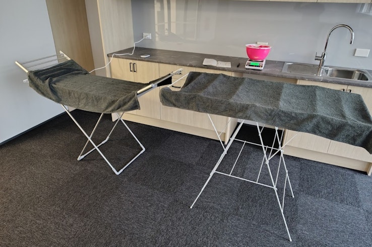 We set up the drying racks side by side in the warm Consumer NZ office. We took two identical towels, with a dry weight of around 600g each, washed them, spun them at 1200rpm and then weighed them damp. Then we draped each towel flat over one of the racks. We did this to maximise contact with the heated rails. Every hour, we weighed the towels to see which was drying faster.