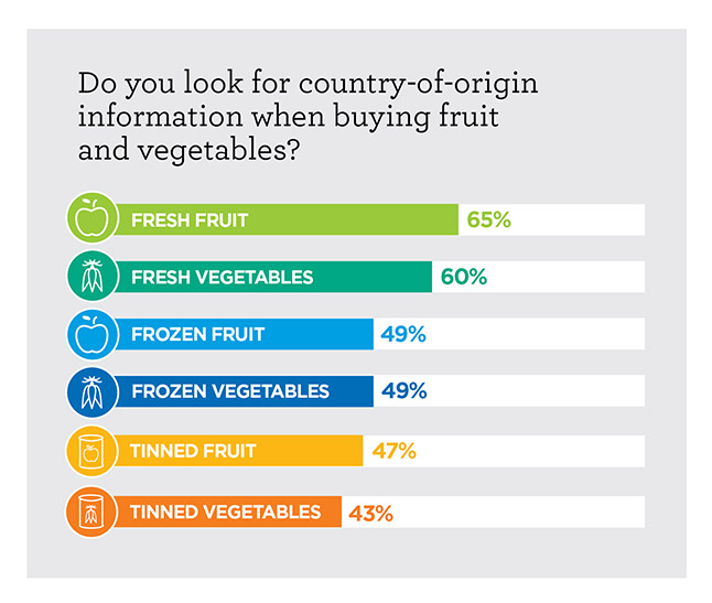 Consumers are more likely to look for country of origin information when buying fresh fruit and veges. Specifically, 65% look for country of origin information when buying fresh fruit and 60% do so when buying fresh veges.