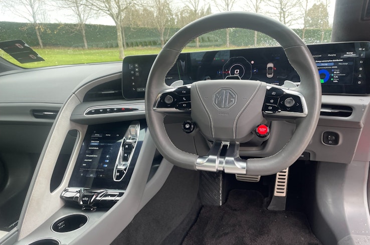 Luckily, I was wrong. Contrary to MG’s rich history of producing tiny sports cars, the Cyberster is bigger than you’d expect. However, I did have to fold myself in after the self-opening scissor doors had done their thing. And once my very long legs were in place, it became clear I’d have to scootch down slightly to see out the front – and be wary of my knee hitting the seat controls on the door (that happened a few times).