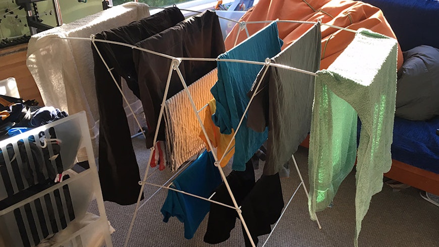 TIP:Make like a DOC Hut: putting the drying rack next to (or above) an electric heater or woodburner will dry clothes faster and keep moisture airborne. You must ventilate the room well though (open a window or two), otherwise you’ll end up with an unhealthy living space full of warm, moist air.
