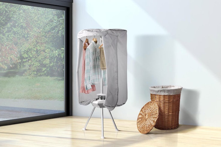 Running a dehumidifier next to the clothes rack adds cost, but you get a triple-whammy of benefits: the dehumidifier heats the room, creates a breeze to help the laundry dry, and sucks up moisture. When I tried a Mitsubishi Electric model running full bore on “laundry” mode next to the drying rack, my clothes were dry in five hours and my room ended up 3°C warmer, with lower humidity than when I started. However, the dehumidifier used 1.9kWh of electricity (costing about 50¢). While I couldn’t fault the increased drying performance, the impact on my wallet was surprisingly high, and the dehumidifier’s noise rendered the room uninhabitable for five hours.