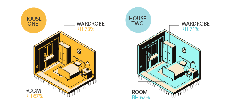 To start, we let them gather data over a few days to give us a baseline and check to see if the wardrobe consistently had higher humidity than the rest of the room. It did. During our trial, the wardrobes hovered at about 20°C with 70% relative humidity (RH), and consistently stayed between six and eight percent higher than the bedrooms.
