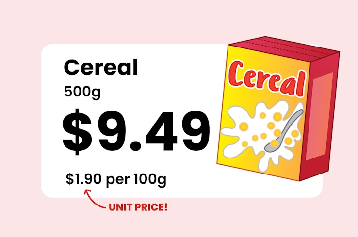 The unit price is the smaller money amount that usually sits at the bottom of the price tag. It shows you how much the product costs per unit of measure. The measure could be per kilogram or litre or per item for example. When you use the unit price, you can see how much you’re paying per egg, per nappy or per 100 sheets of toilet paper.