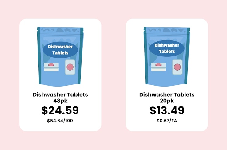 Imagine you’re trying to work out which pack of toilet paper to buy – the decision might be between a 4-pack, a 6-pack or an 8-pack. Unit pricing lets you see how much you’ll pay per 100 sheets. Of course, you might still want to take ply into account, but it’s easier to see which product gives you more bang for your buck.