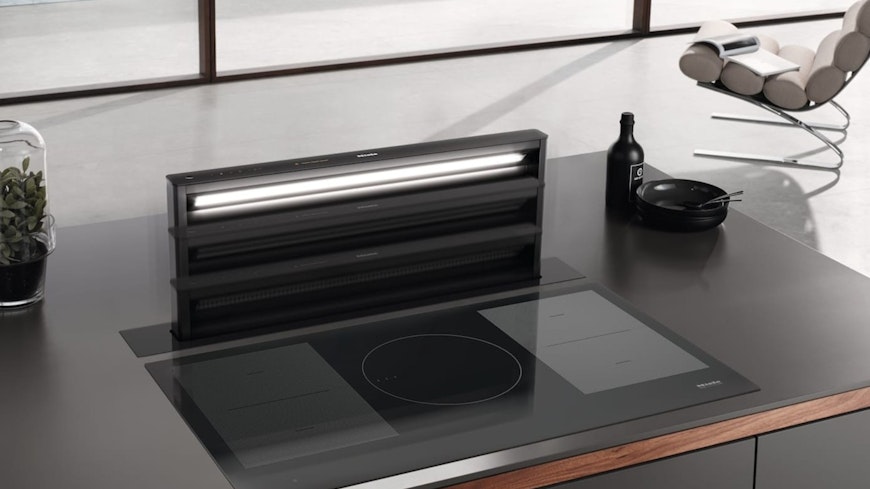 The downdraft extractor (or ventilator) usually sits at the rear of the cooktop. When it is turned on, it rises to reveal the extractor ports, which suck in steam and smells.