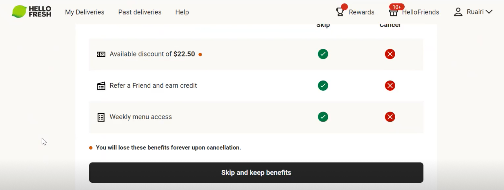 You’ll be encouraged to join HelloFresh’s reward scheme and told, in no uncertain terms, what you’ll be missing if you leave. “You will lose these benefits forever upon cancellation,” you’re informed.