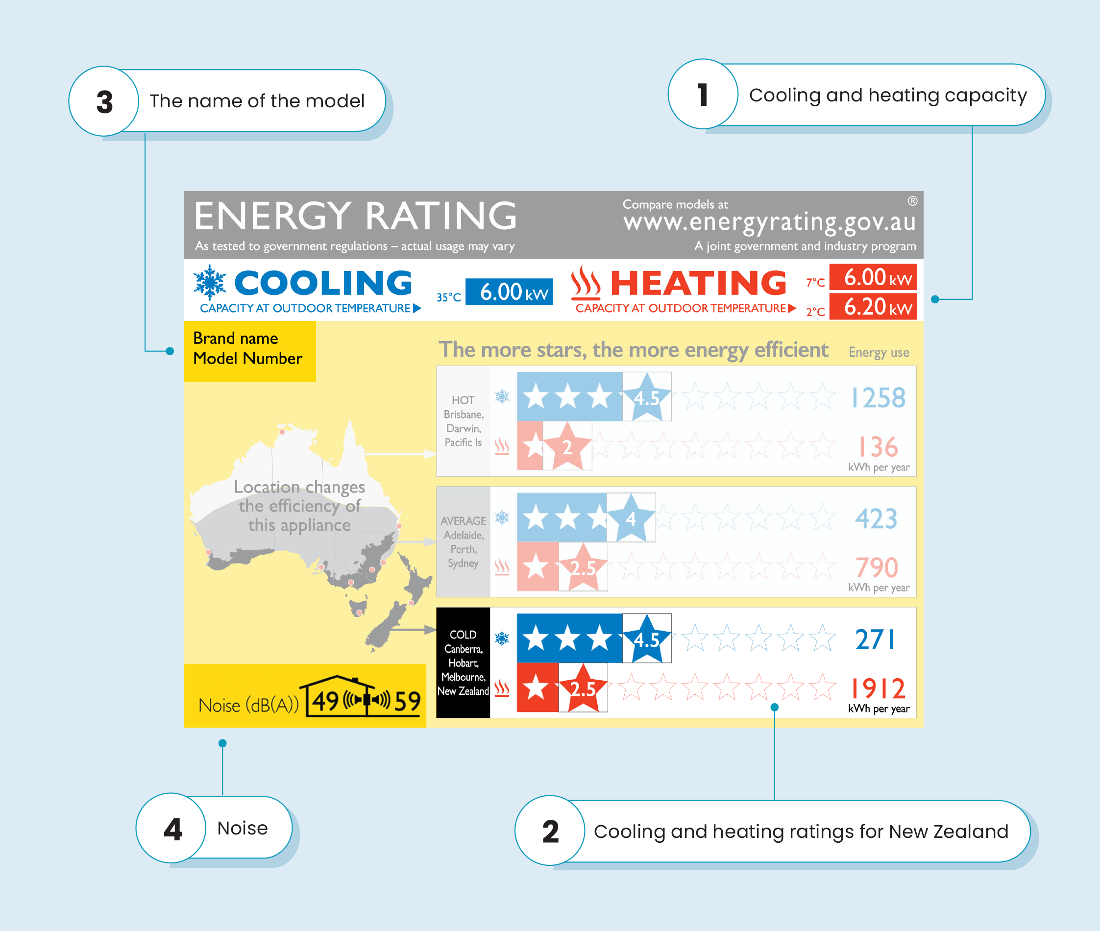 Heat pumps can be noisy beasts, both inside and outside of the house. To help you compare models and see which will be quieter, the ZERL now includes noise readings. This reading is optional in New Zealand, so you may see a mix of labels with and without noise readings.